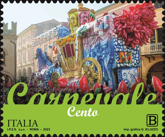 📮 Francobollo 2023: raffigura un carro allegorico denominato “I sette vizi capitali”, realizzato dall’Associazione Carnevalesca “Mazzalora”, nel momento del secolare “Gettito” mentre sfila a Piazza Guercino nel centro storico di Cento.
