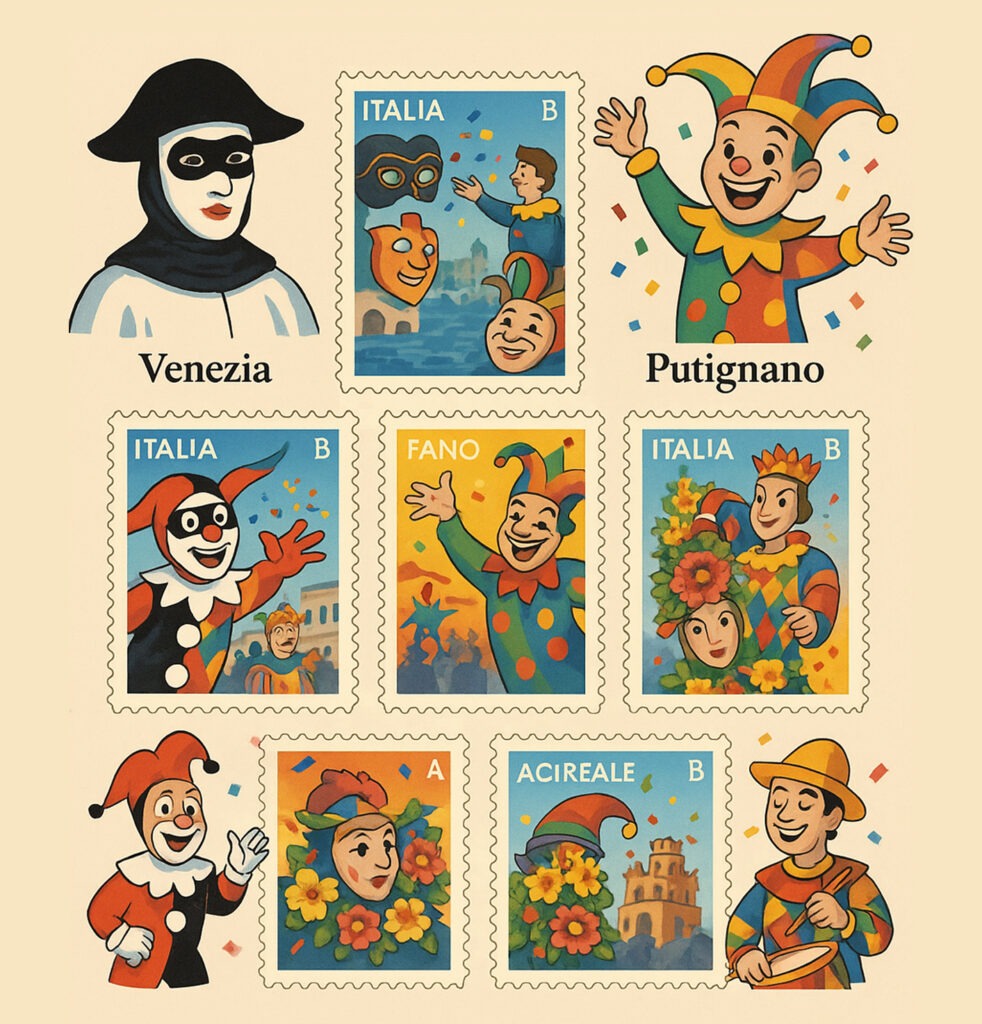 Attraverso i francobolli emessi nel 2023, questi Carnevali diventano anche patrimonio filatelico, piccoli scrigni di carta che racchiudono secoli di cultura, satira e bellezza.