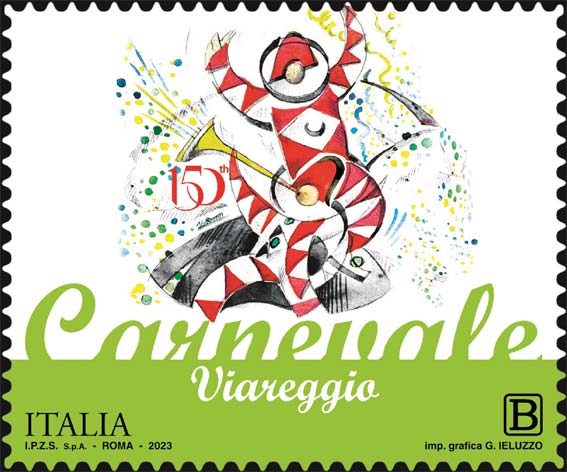 Francobollo 2023: riproduce un’opera di Uberto Bonetti realizzata negli anni ’30 raffigurante, su campo bianco, tra lanci di coriandoli, stelle filanti e squilli di tromba, due Burlamacchi, la maschera rappresentativa del Carnevale di Viareggio e mascotte della città. A sinistra, incastonato nella composizione, è riportato il numero “150th” a indicare gli anni trascorsi dalla prima sfilata del Carnevale.
